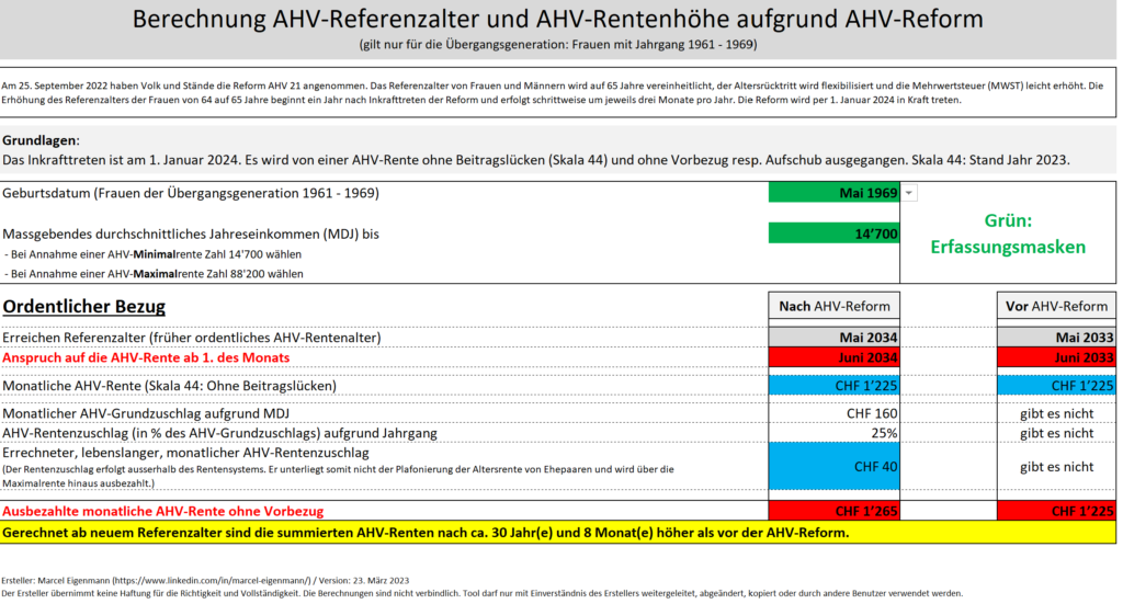 Das AHV-Tool wurde privat entwickelt. Es darf nicht weitergeleitet, abgeändert oder kopiert werden werden! Zudem ist es nicht erlaubt, das Tool zu speichern! Das Tool eignet sich primär für alleinstehende Personen.