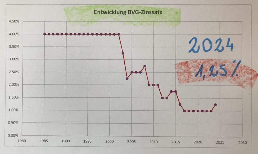 Der BVG-Zinssatz bestimmt, zu wieviel Prozent das BVG-Altersguthaben mindestens verzinst werden muss. Der Mindestzinssatz wird vom Bundesrat festgelegt. Dieser berücksichtigt dabei die Renditeentwicklung verschiedener Wertanlagen wie Bundesobligationen, Anleihen, Aktien und Liegenschaften.
